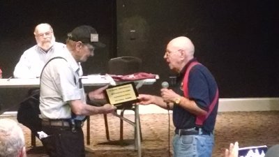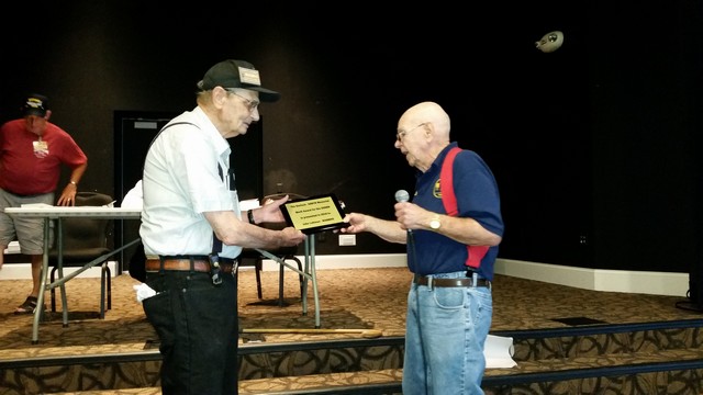Dick Fletcher, N8CJS presenting John Lehman, WA8MHO with the prestigious award for 2016 |